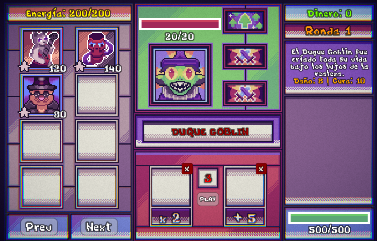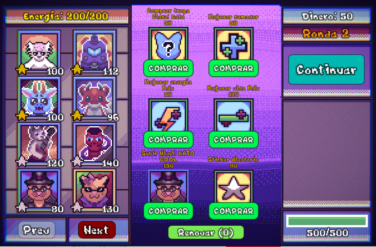 Felinia es un roguelike de batallas por turnos en el que comandas unidades de tres familias: gatos 🐱, robots 🤖 y dragones 🐉. Cada unidad se coloca en un slot de ataque donde interactúa con las demás para maximizar sinergias y derrotar oleadas de enemigos.